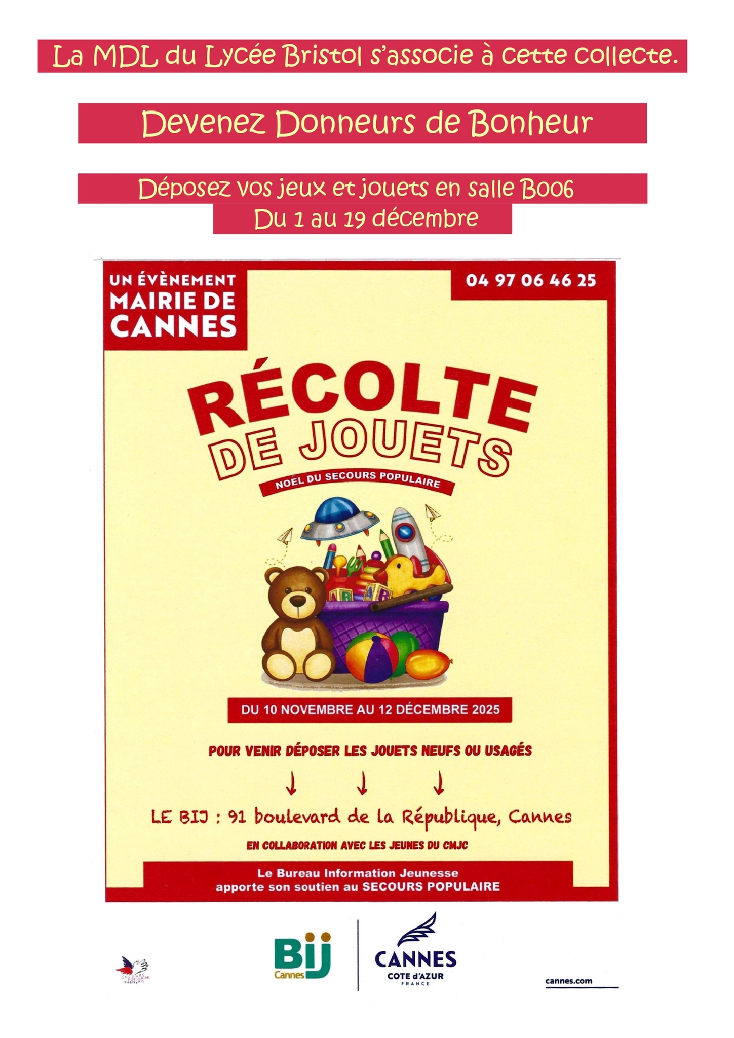 Lycée Bristol Cannes LYCEE GENERAL ET TECHNOLOGIQUE Collecte de jouets En Savoir + Rentrée 2025 Nous contacter L'offre de formation Offre de formation En Savoir + S'inscrire ou se réinscrire au Lycée Bristol Inscriptions et réinscriptions En Savoir + PRONOTE Télécharger le Certificat de scolarité depuis PRONOTE En Savoir + Acheter ses repas avec MyTurboself En Savoir + Bienvenue sur le site officiel du Lycée Bristol