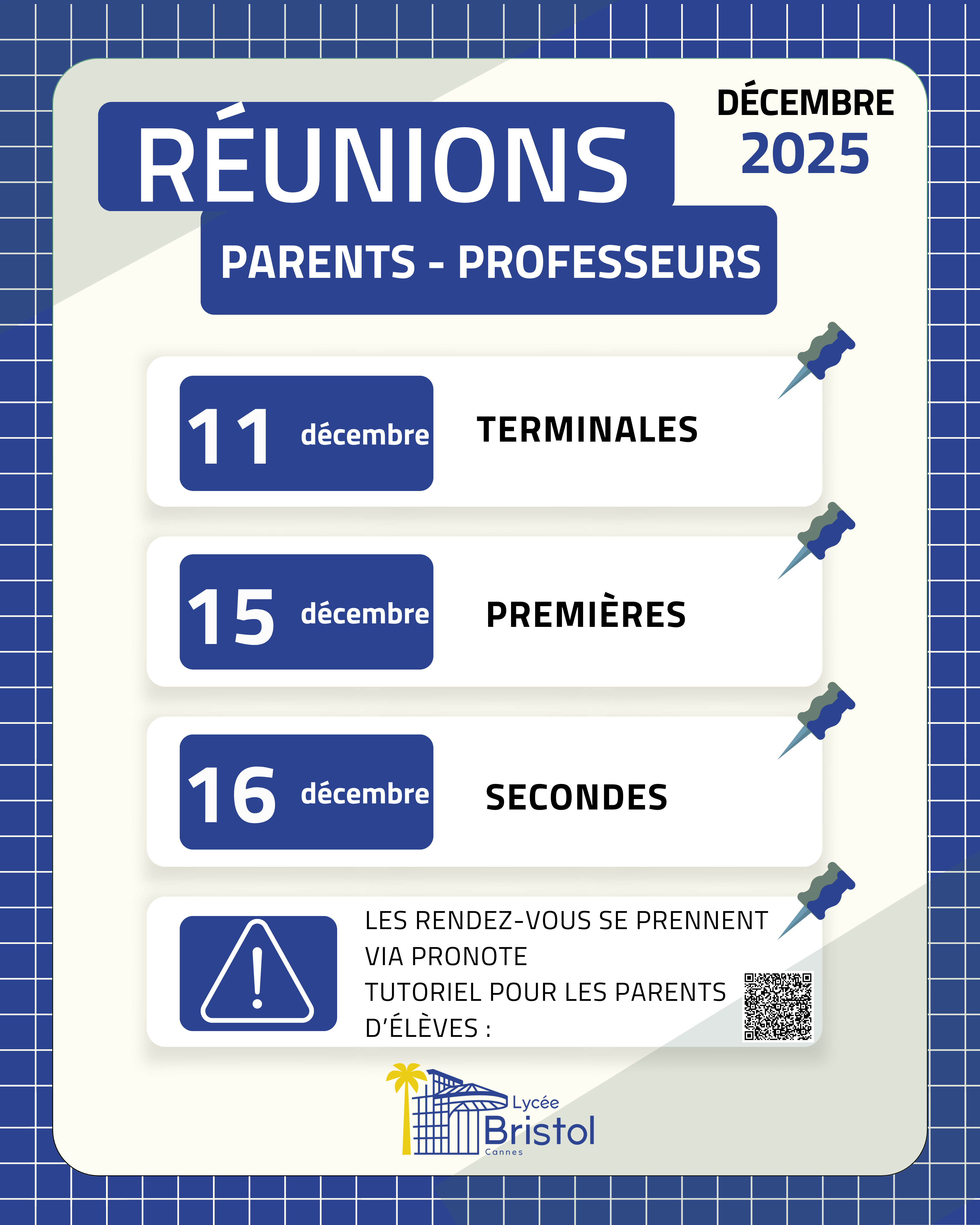 Les prises de rendez-vous se font via Pronote, un tutoriel explicatif à destination des parents d'élèves est accessible sur le lien suivant: