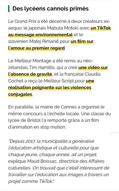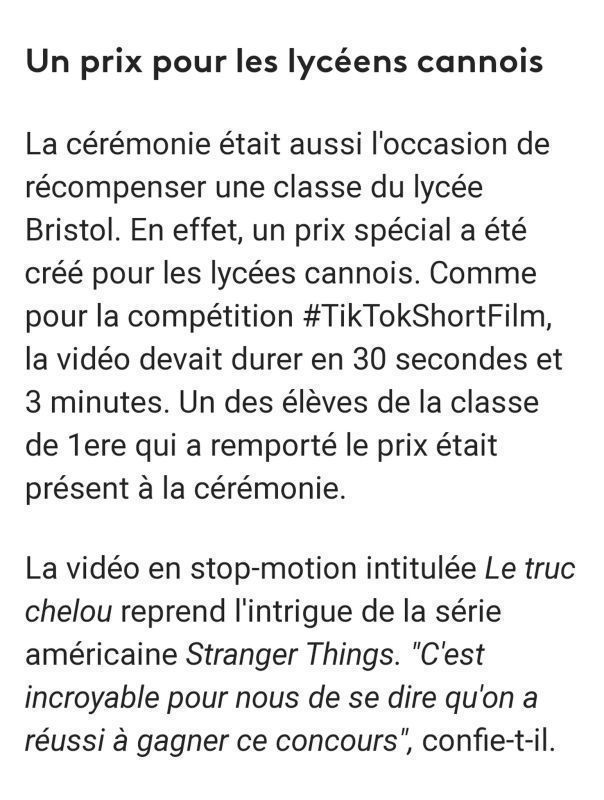 Cette compétition de la meilleure vidéo des lycéens cannois s’est déroulée dans le contexte de la compétition internationale #TikTokShortFilmCompetition, organisée par TikTok pour célébrer son partenariat avec le Festival de Cannes et encourager la création audiovisuelle.