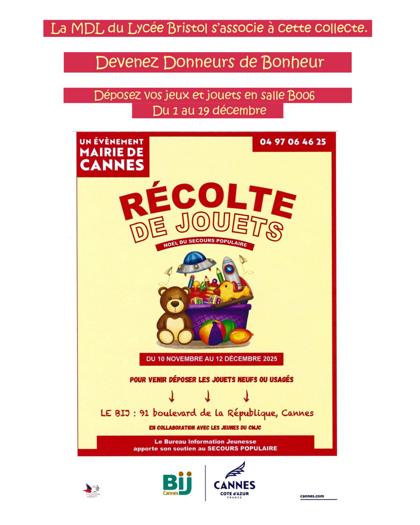 Découvrez nos projets : Concours d'éloquence Concours d'éloquence inter-établissements du réseau Cannes Pays de Lérins Thème : Peut-on rire de tout ? (ou bien thème sur un sujet libre). Date et lieu d ...